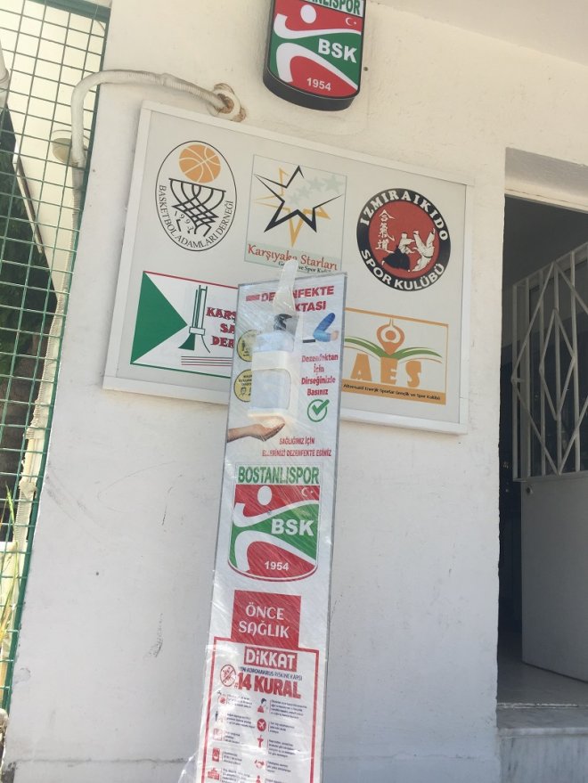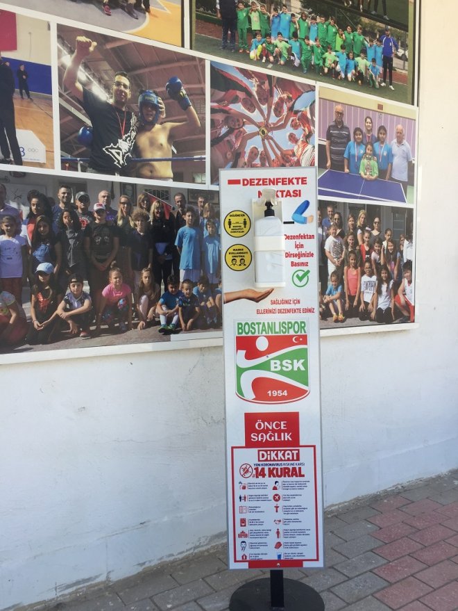 Kulüp binası olmak üzere tüm spor yapılan kapalı ve açık sahaları dezenfekte eden Bostanlıspor tesis ve saha girişlerine de el deymeyen otomatik dezenfektan makinesi koydu.