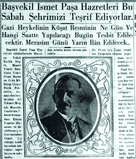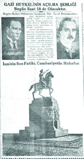 Gazi Hazretlerinin bir heykelini yaptırmaya karar vermişti. Heykeltıraş Kanonika tarafından ihtimamla hazırlanan bu büyük eserin yerine konması bitmiştir. Temmuzun 27 inci Çarşamba günü heykelin açılma merasimi, İzmirin en tarihi günlerinden biri olacaktır. O gün; Başvekilimiz İsmet Paşa Hazretleride İzmirde bulunacak ve resmi küşadı bizzat icra edecektir.”