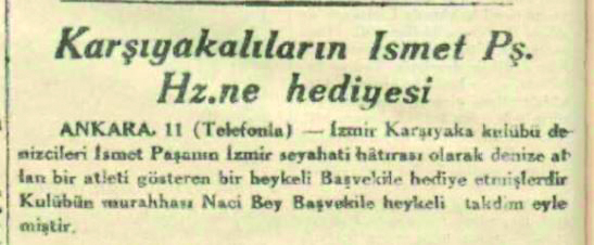 Ziyaretten kısa bir süre sonra, Karşıyakalı denizciler, Ankara’da, Başvekilimize, denize atlayan bir sporcu heykeli hediye ve takdim etmişlerdir.