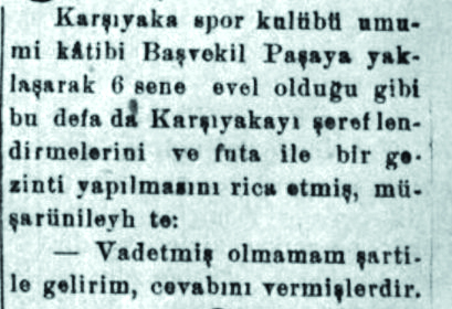 Şarkspor ziyareti sonrası otomobille Karşıyaka’ya geçen paşa, yanında Hariciye vekili Tevfik Rüştü, Nafia Vekili Hilmi, Maarif Vekili Mahmud Esad, Vali Kazım Paşa, C.H.F.Müfettişi Hacim Muhiddin bey, Belediye reisi Behçet Salih bey, Kolordu kumandanı Ali Hikmet bey, müstahkem mevkii kumandanı ve K.S.K. hami reisi Hüseyin Hüsnü Erkilet, Fahreddin Paşalarla birlikte, kulübümüz umumi katibi Cemal Şahingeri bey tarafından karşılanmış ve 6 sene önce olduğu gibi kulübümüzü şereflendirmeleri ve futaları ile gezinti teklifi yapılmıştı.