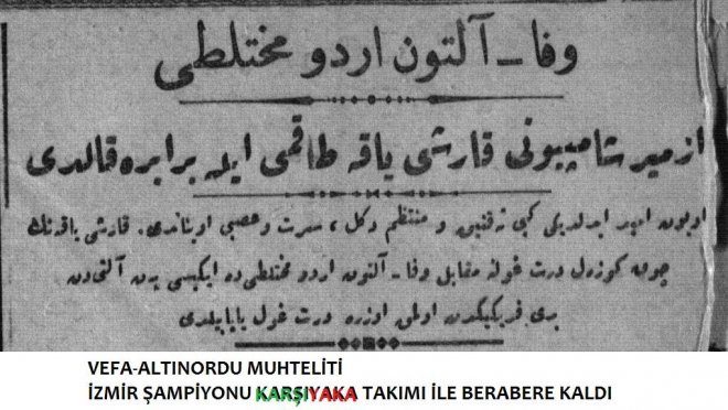 Haziran 1926’da İstanbul’un ve ülkemizin en eski iki kulüplerinden olan Vefa ve Altınordu İdman Yurdu kulüpleri İzmir’e seyahat düzenlemişti. Altınordu kulübümüzün organizasyonu ile, 1908-09 yıllarında kurulan Vefa İdman Yurdu ve Altınordu İdman Yurdu toplamda 5 maç yapmak için şehrimize gelmişlerdi. Vefa ve Altınordu takımlarından başka bir oyuncu da Süleymaniye takımından takviye yapılmıştı.